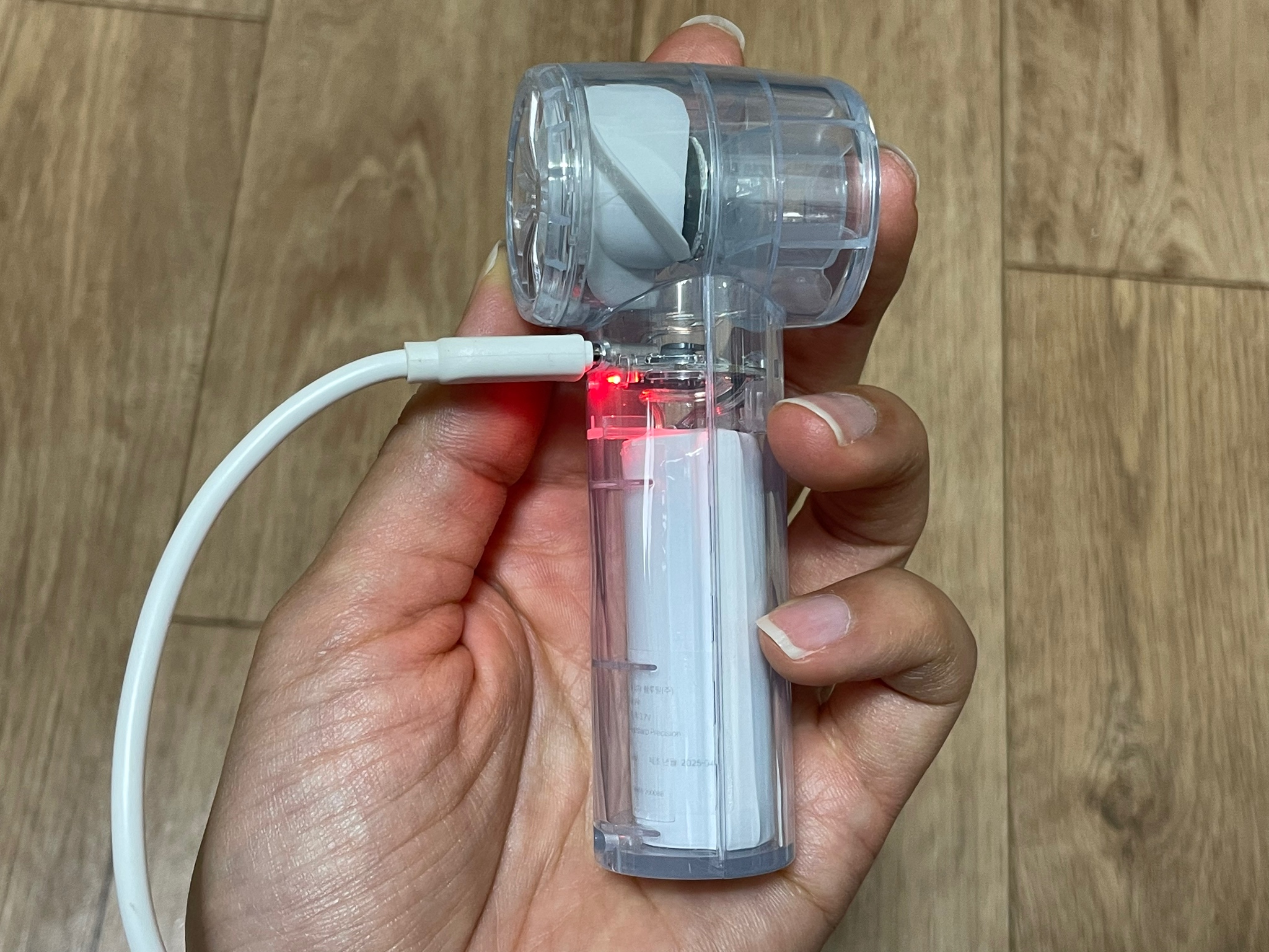 Type-C 케이블로 간편하게 충전 가능하며, 충전 중에는 빨간 LED, 충전 완료 시 파란 LED가 표시됩니다.